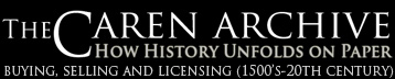 THE CAREN ARCHIVE VAULT A sampling of original items contained in our vaults are: Period Printings of- The Declaration of Independence, US Constitution, Bill of Rights, Louisiana Purchase, Monroe Doctrine, Gettysburg Address original printings and some manuscript material The Colonial Era, The American Revolution and The Federalist Period- Original broadsides on Drake's Circumnavigation, King William's War, William Penn, Queen Anne's War, King George's War, French and Indian War Battles, The Stamp Act, The Boston Tea Party, Lexington and Concord, Bunker Hill, Washington Crossing The Delaware and The Battle of Princeton, Arnold's Treason, The End of The American Revolution, Shay's Rebellion, The Whiskey Rebellion, Defeat of St. Clair by The Indians, The Death of George Washington, etc. Original Letters and Manuscripts- relating to Jamestown (1608), Mass Bay Colony (1650's),King Philips War (1677), The Salem Witchcraft Trials (1693), King William's War (1690's), Queen Anne's War (1708, 09), Rogers Rangers (1756), The Fall of Ft. William Henry (1757), The Boston Tea Party (1773), George Washington Created Commander and Chief (1775), The Declaration of Independence Read to Native American Troops Embarking to fight against the British (1776), Washington Crossing The Delaware (1776), The Battle of Princeton (1777), The End of The American Revolution (1781), Washington to Assume Presidency (1789), The Whiskey Rebellion (1794), The Louisiana Purchase (1803), Battles of The War of 1812 (1812-1815), The Fall of The Alamo (1836), United States Takes California (1846), Mexican War Battles (1846-48), Civil War Battles (1861-1865), The Assassination of Lincoln (1865), Custer's Last Stand (1876), The Northfield Bank Robbery by The James-Younger Gang (1876), The Founding of Tombstone Arizona (1880's), Edison's Invention of The Light Bulb (1880's), Spanish American War Battles (1898), The NY Giants Winning The Second World Series (1905), The Titanic (1912), The Lusitania (1915), WWI and WW2, Eniac (1945) and Space Race (1957-1969) etc. Original Newspapers, Periodicals, Photographs, Maps, Engravings and Ephemera: relating to every major event from Columbus to Present, Every major genre including Minorities, Wars, Politics, Presidents, International, Sports, Entertainment, Transportation, Aviation, Pirates, Outlaws, Gangsters and other Important Crime, etc. |
